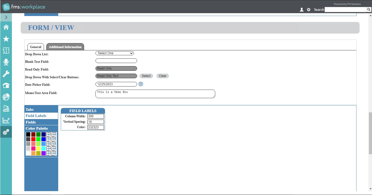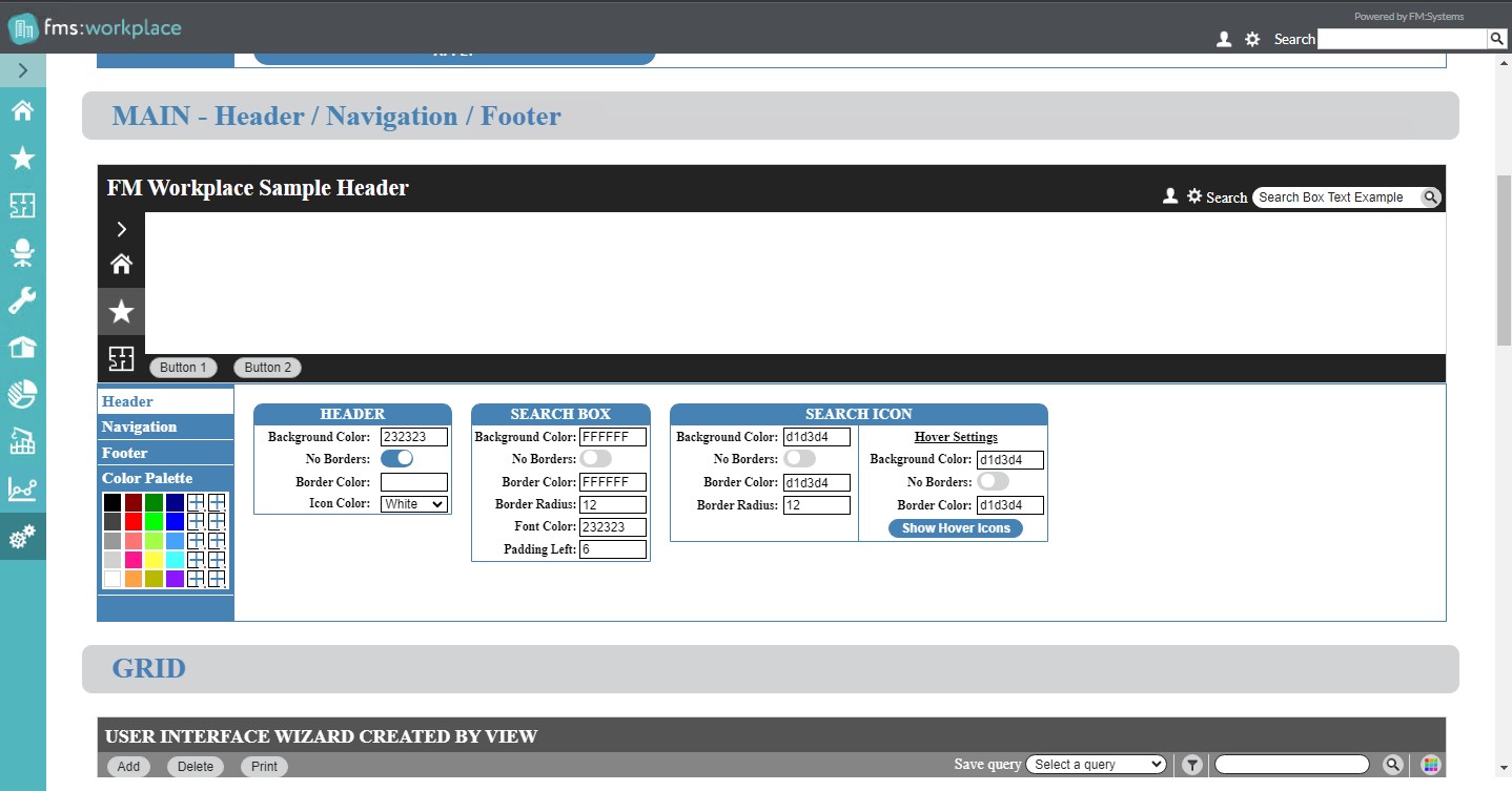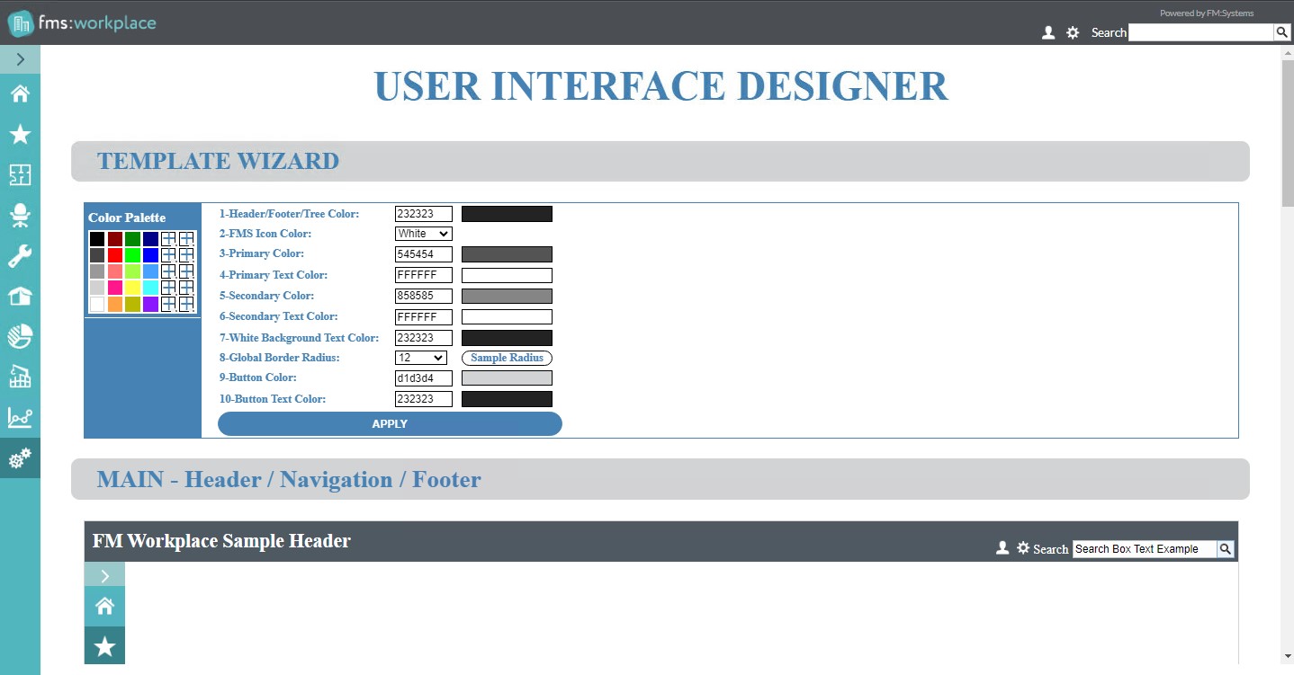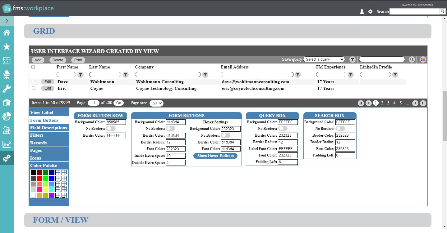 Reskin FMS:Workplace quickly, easily, and on the fly, using a live screen mockup for over 160 UI elements – including: background color, font color, borders, spacing, border radius, hover appearance, etc.